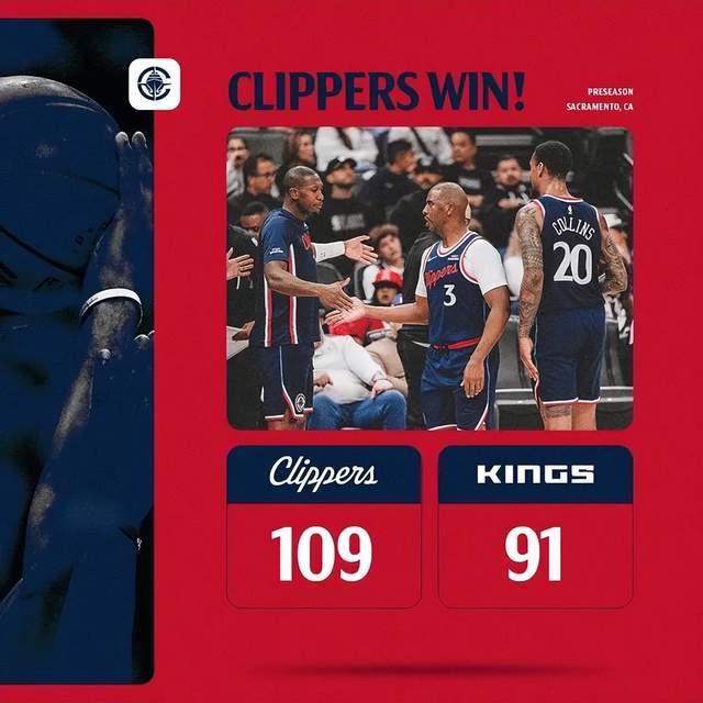 北京时间10月16日,NBA季前赛,快船109-91国王。快船队科林斯24分,大洛16分,伦纳德15分,小琼斯12分,保罗8分10助攻,哈登8分3助攻,祖巴茨4分8板4助攻,比尔休战;国王队克利福德19分,小萨15